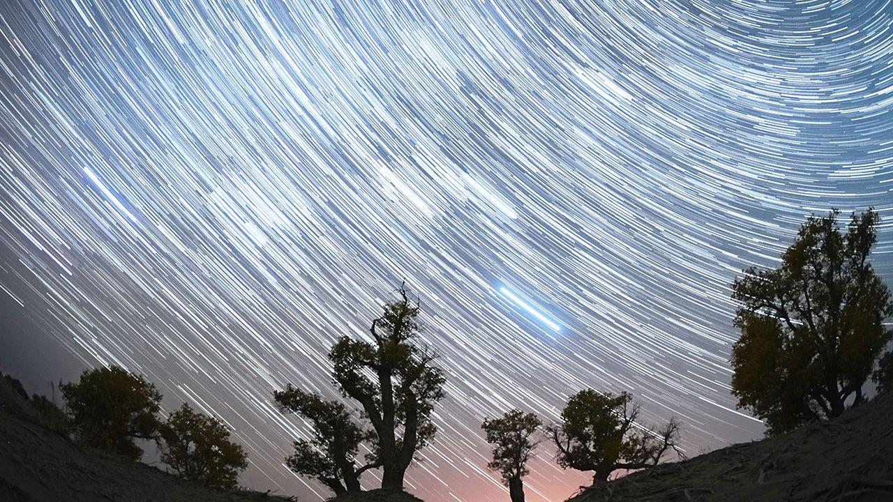 Meteors streak across the sky over a desert during the Orionid meteor shower on October 22, 2023, in Yuli County, China. (VCG/VCG via Getty Images)
