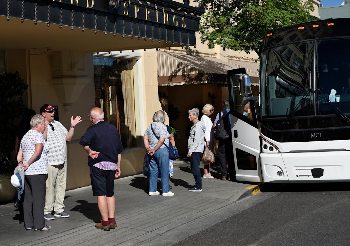 A group of British tourists prepare to board their chartered tour bus in front of a hotel in Ashland, Oregon. (Robert Alexander/Getty Images) · Robert Alexander via Getty Images