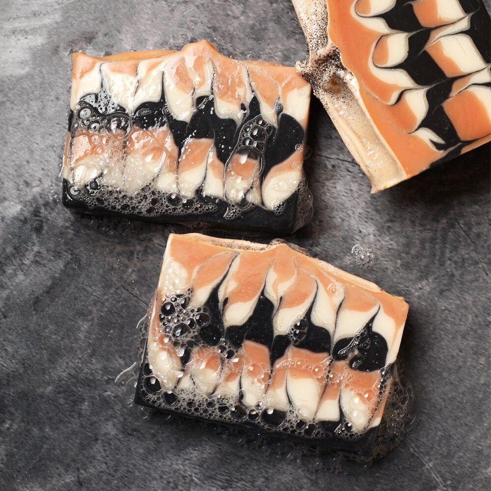 Perfect for a hot bath on a cold night, this Pumpkin Sandalwood Soap features a Hanger Swirl in classic Halloween colors, and a bit of spooky sparkle. We mixed warm and homey Pumpkin Sandalwood Fragrance Oil with swirled Halloween colors to make this beautiful autumn soap.