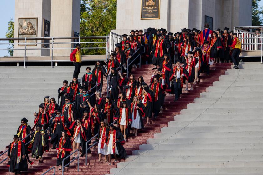 USC graduates walk onto the field during the 2025 commencement ceremony at the Los Angeles Memorial Coliseum on May 15. (Juliana Yamada / Los Angeles Times)